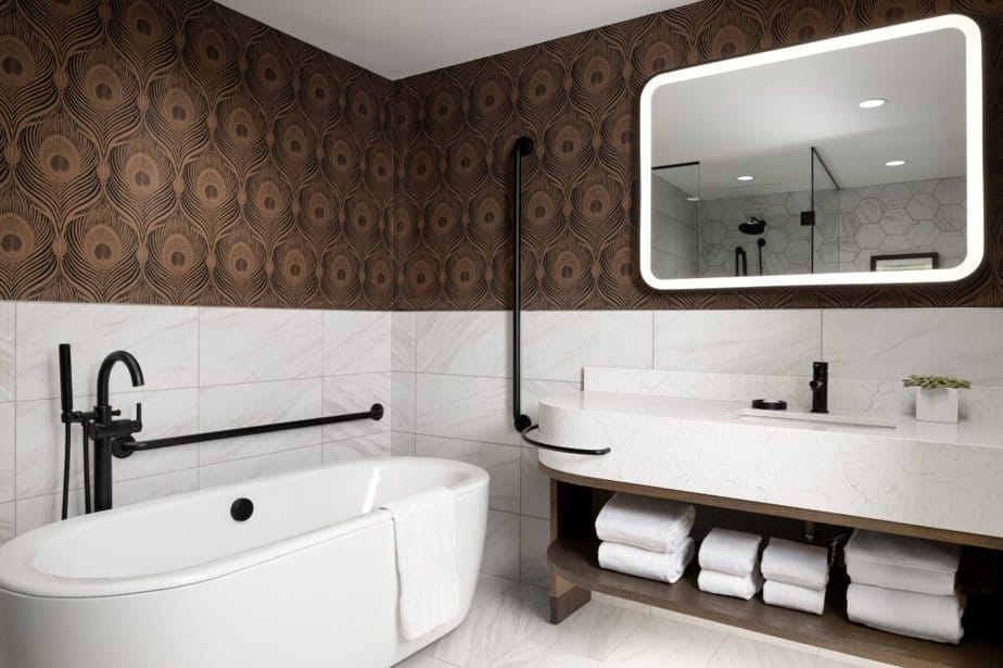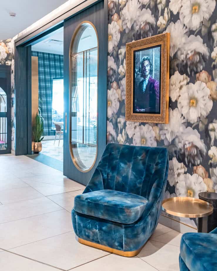 The Dorian, Autograph Collection is the result of an obsession with England. The developer, Patricia Phillips, CEO of PBA Group, spent several years in London and then labored for ten years in Calgary to bring her British inspired vision to life. English cottage-core floral wallpaper, brass fittings, and hounds tooth patterned fabrics meet mid-century modern lighting and a love affair in teal and violet ensues. A bottle of the bespoke house spirits, Earl Grey Gin by local Eau Claire Distillery awaits you on a brass trolley cart, along with martini glasses, and a cocktail shaker. Teatotallers can simply reach for the ceramic Haden kettle and open a box of fragrant specialty teas. Sip tea, or spill the tea, your choice.