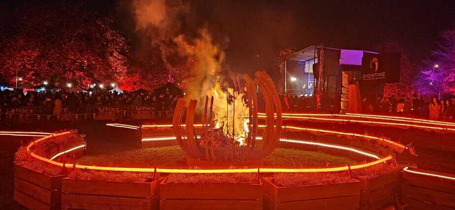 Finally the first beacon of light appeared. The runners had arrived. They quickly lit the tops of the stone pillars and the bonfire in the centre of the maze, sending paper wishes flickering into the night sky. The musicians on the nearby stage began to play as the crowd cheered, paid their respects to Puca, and moved on into the night to enjoy more of the Puca Festival.